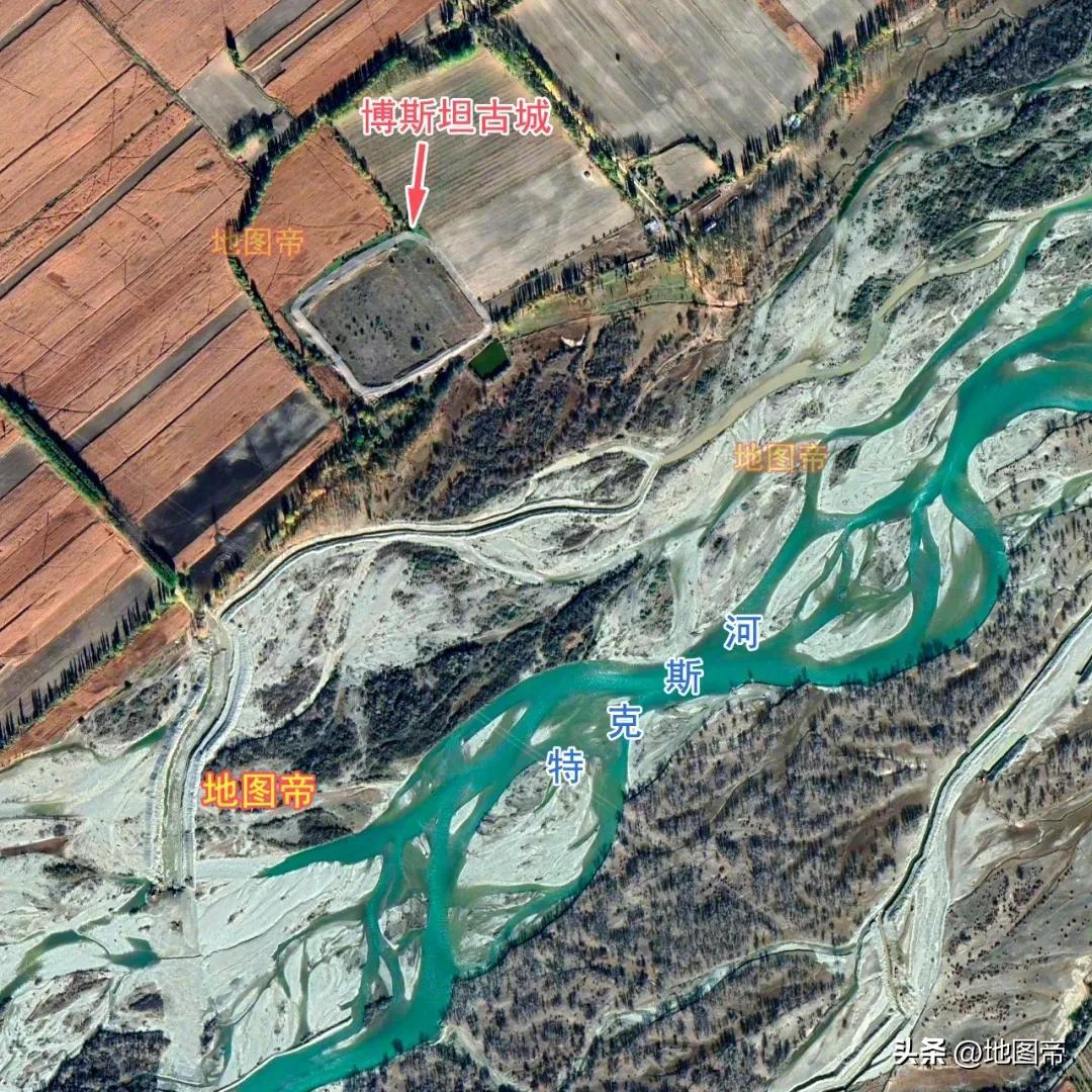 博斯坦古城位於特克斯縣城西南約兩千米,地處特克斯河北岸階地上,南距特克斯河約200米,海拔約1218米。博斯坦古城呈長方形,東西長206米,南北寬162米,城牆高5到7米。