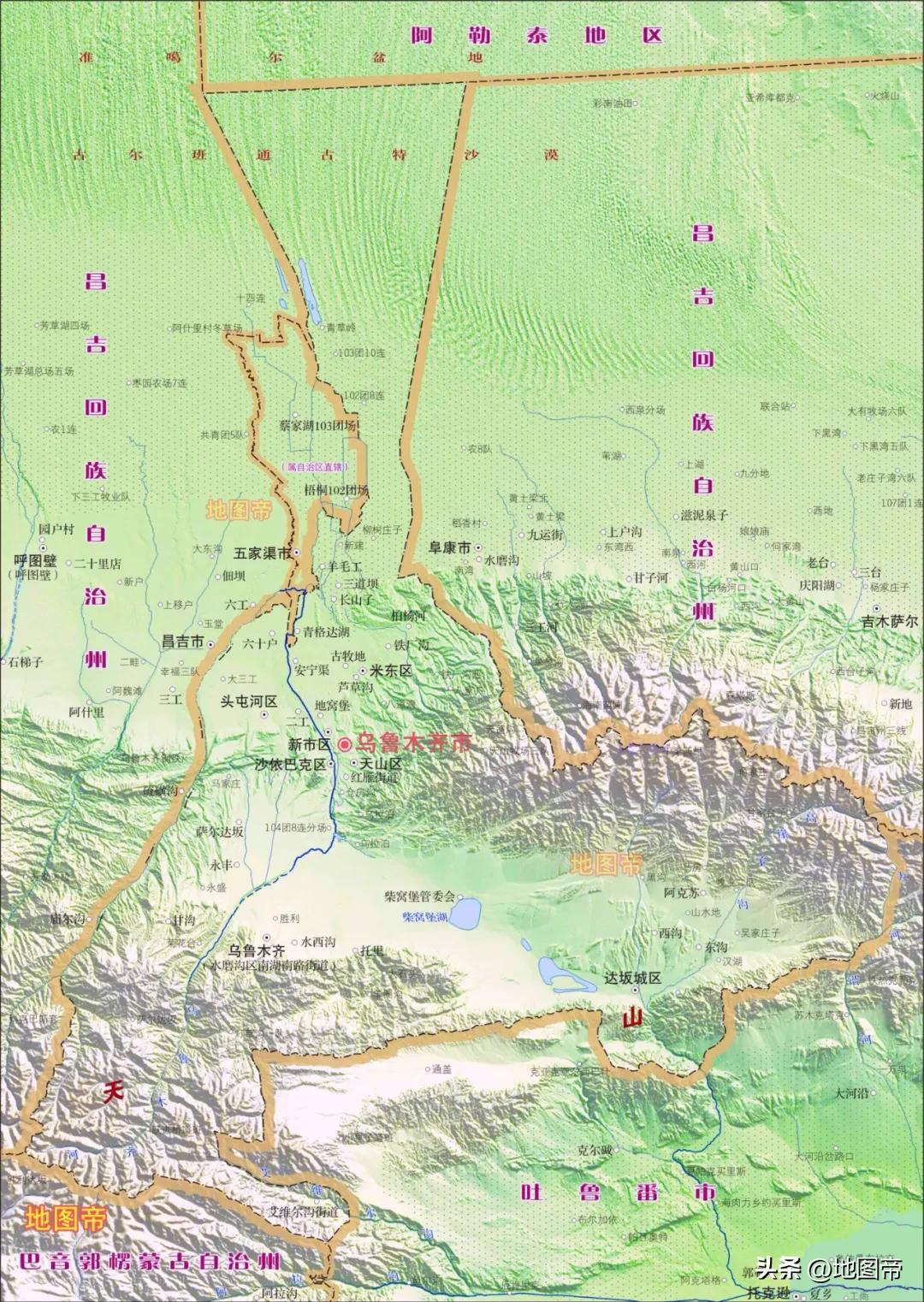 烏魯木齊的地圖,看起來像一個帶着漏斗的容器。烏魯木齊地勢南高北低,最高峯爲博格達山的主峯,海拔約5445米。