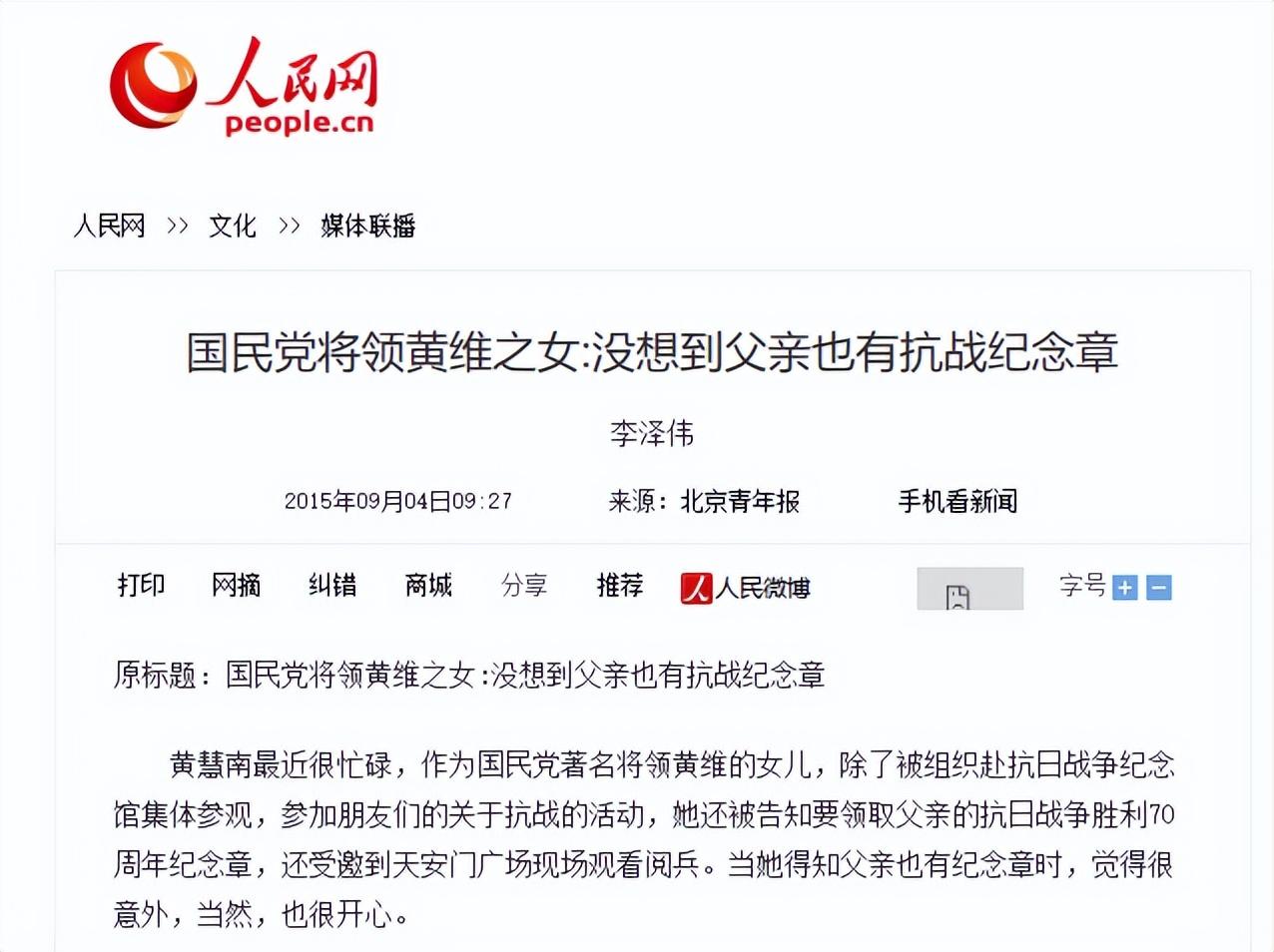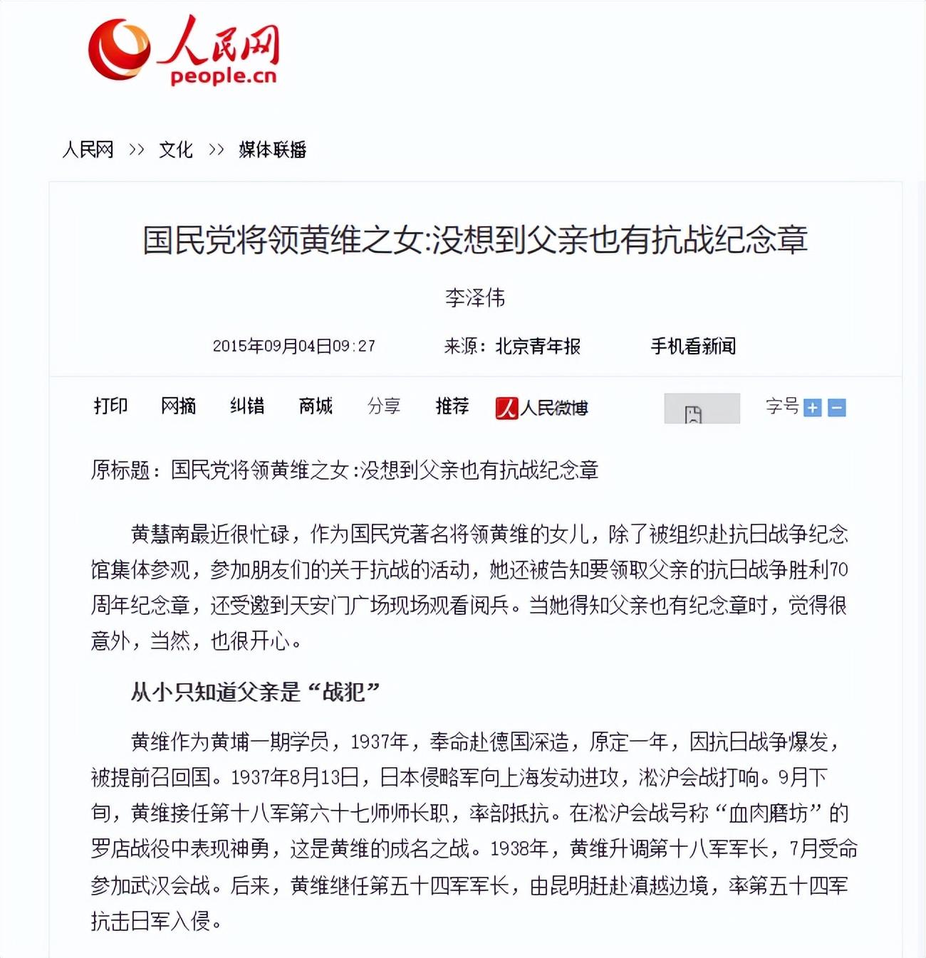國民黨將領黃維之女:沒想到父親也有抗戰紀念章,人民網-北京青年報,2015年09月04日