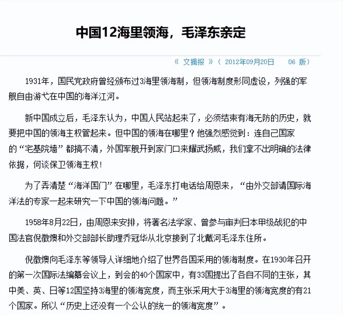 中國12海里領海,毛澤東親定,《文摘報》(2012年09月20日06 版)
