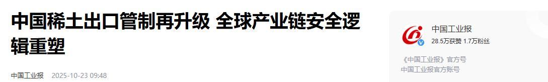 2.《中國稀土出口管制再升級 全球產業鏈安全邏輯重塑》2025-10-23 09:48 | 來源:中國工業報