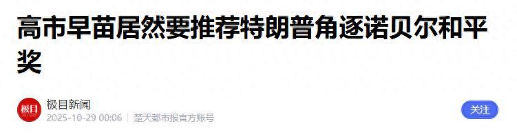 1.《高市早苗居然要推薦特朗普角逐諾貝爾和平獎》2025-10-29 00:06 | 來源:極目新聞