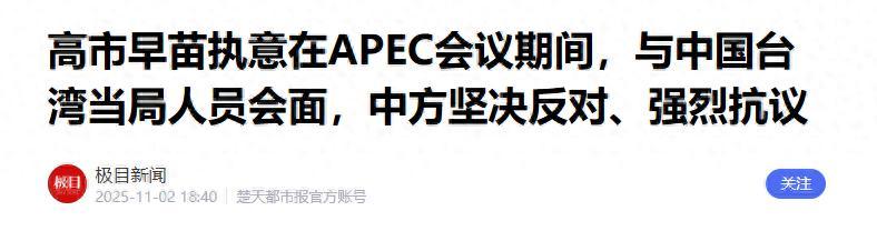 1.《高市早苗執意在APEC會議期間,與中國臺灣當局人員會面,中方堅決反對、強烈抗議》2025-11-02 18:40 | 來源:極目新聞