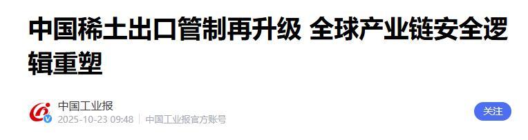 2.《中國稀土出口管制再升級 全球產業鏈安全邏輯重塑》2025-10-23 09:48 | 來源:中國工業報