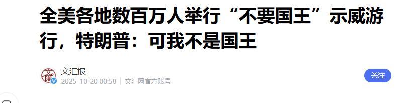 3.《全美各地數百萬人舉行“不要國王”示威遊行,特朗普:可我不是國王》2025-10-20 00:58 | 來源:文匯報