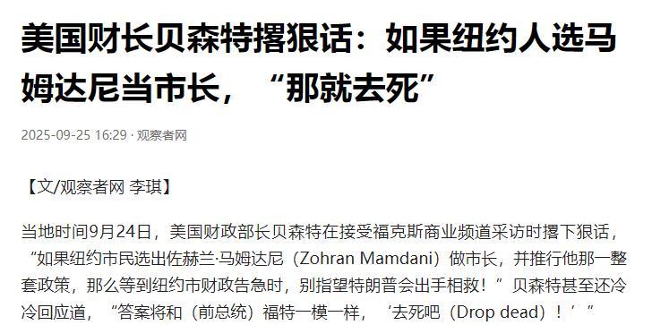 美國財長貝森特警告,如果紐約人膽敢選馬姆達尼當市長,一旦紐約財政告急,聯邦政府絕不會出手相救,特朗普更是威脅,一旦馬姆達尼當選,他將立刻停止聯邦對紐約的撥款。