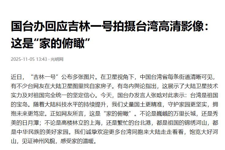 “吉林一號”公佈臺灣高清衛星影像,國臺辦:這是“家的俯瞰”,光明網,2025-11-05