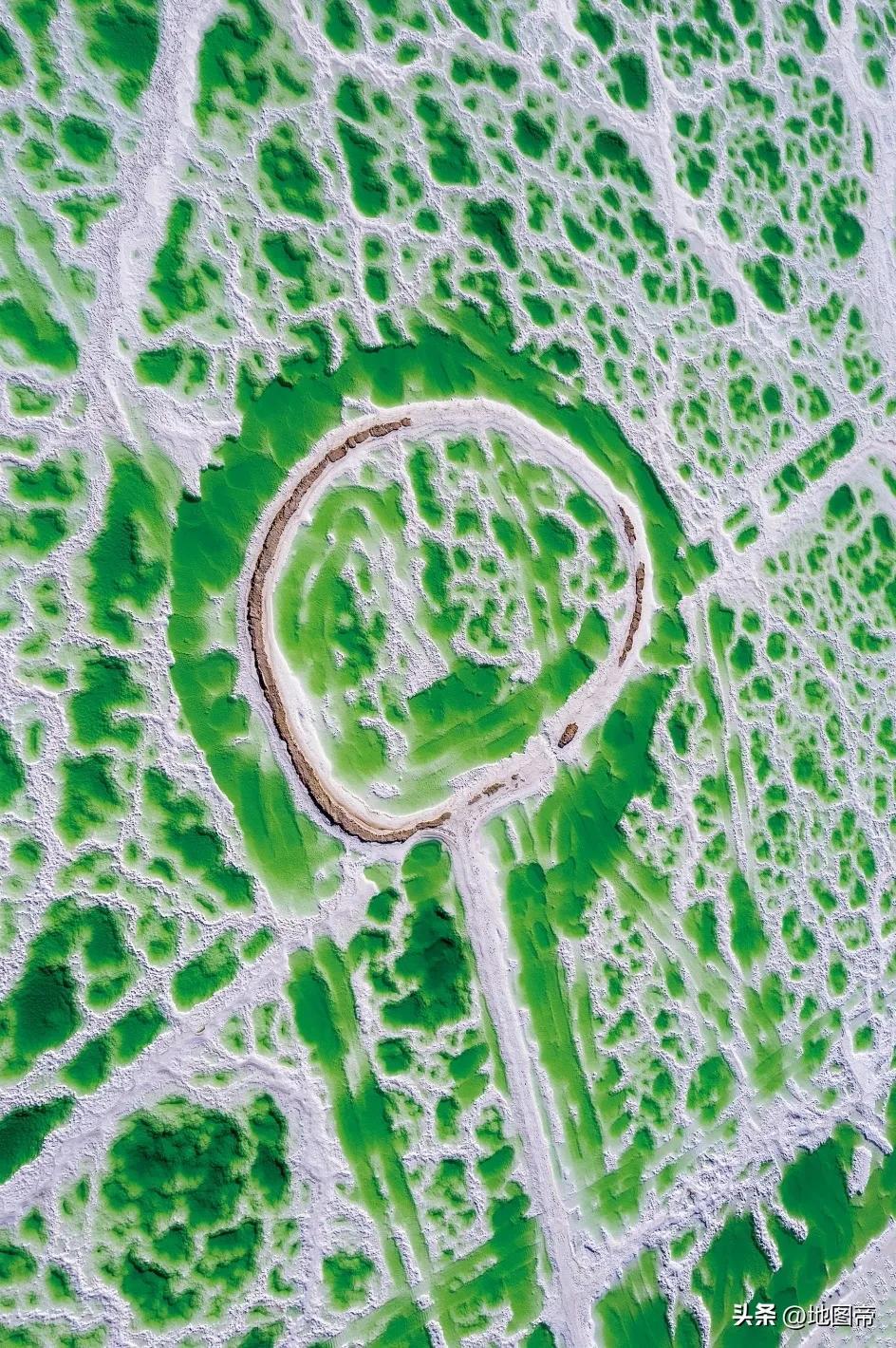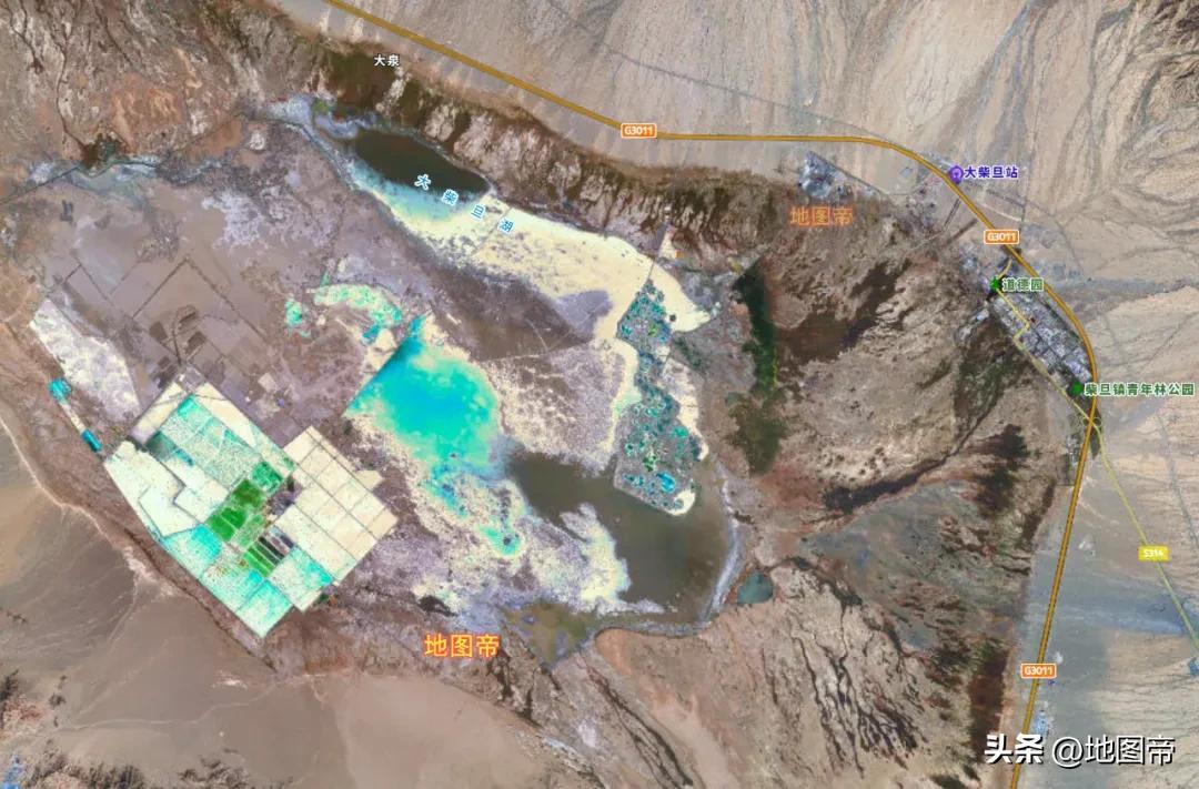 大柴旦翡翠湖位於柴達木盆地東北部,面積15平方千米,屬硫酸鎂亞型鹽湖,鹽牀由淡青、翠綠以及深藍的湖水輝映交替、晶瑩剔透,稱爲“大地調色盤”。