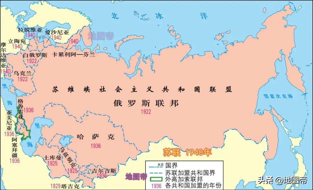 1922年,俄羅斯聯邦、外高加索聯邦、烏克蘭、白俄羅斯成立蘇聯,後來陸續擴至15個加盟共和國,包括波羅的海三國,時間跨度是1922年-1991年。