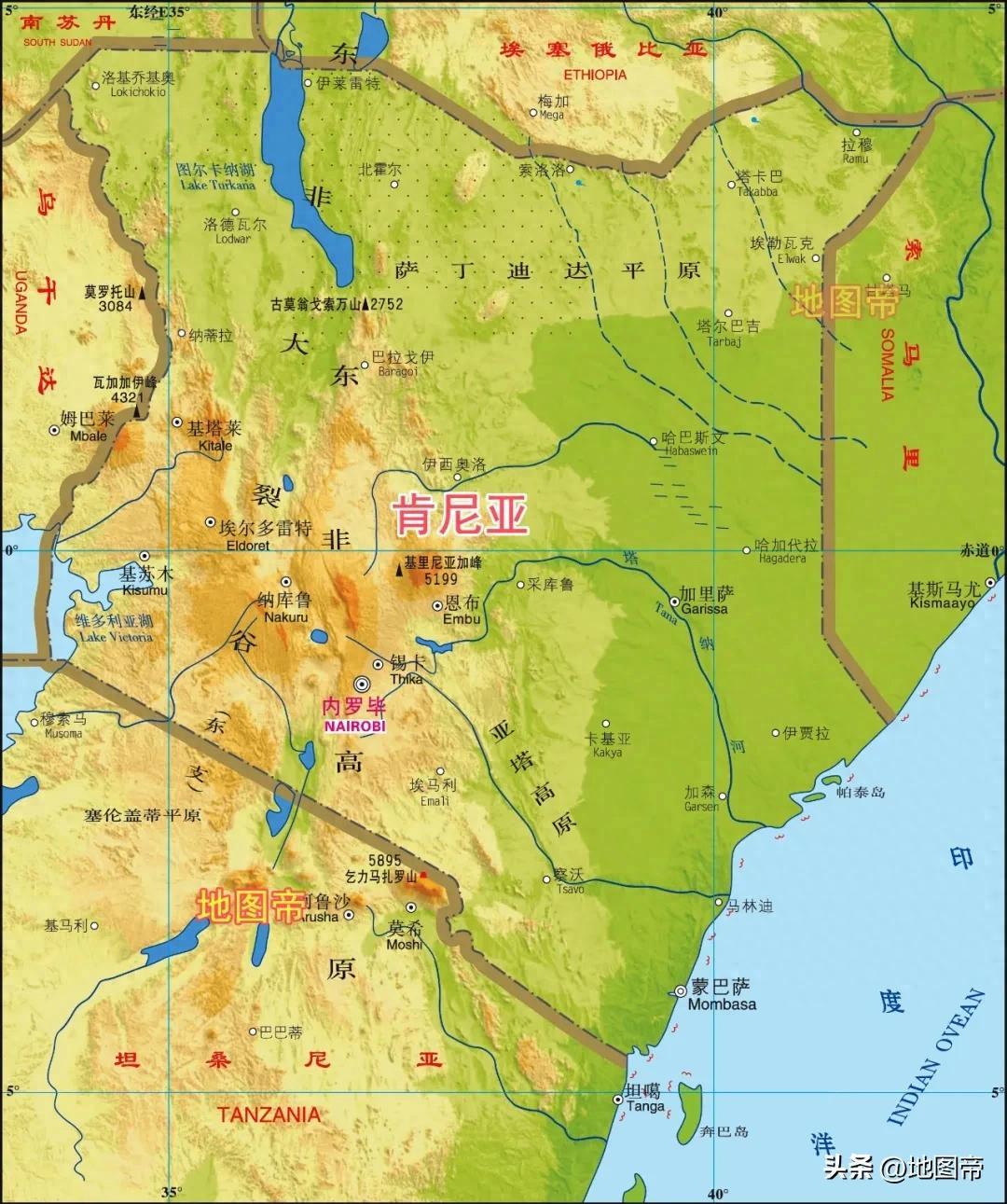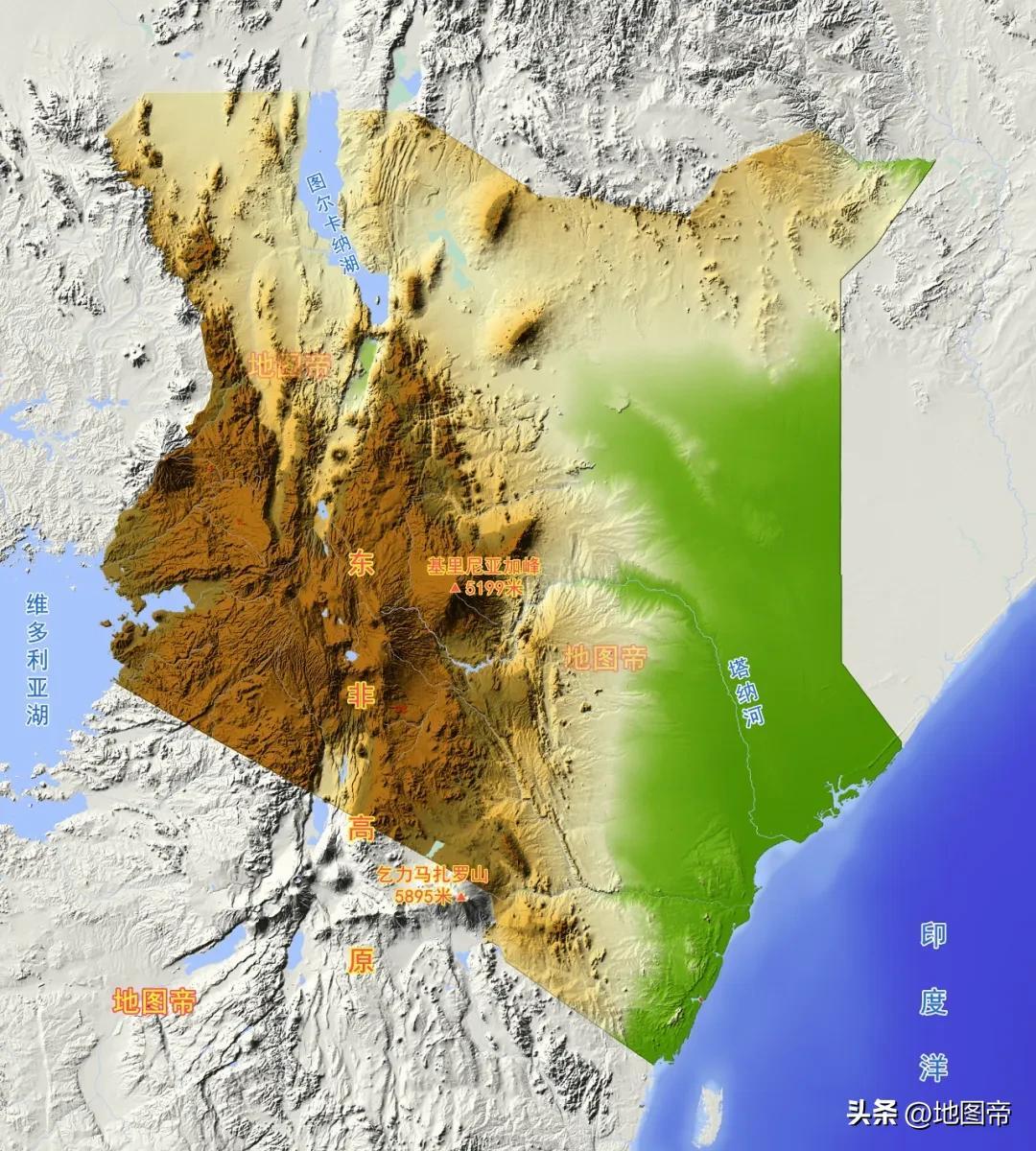 肯尼亞多高原,中西部是東非高原,最高峯基里尼亞加峯,海拔5199米,是非洲第二高峯。基里尼亞加峯緯度是南緯0°9′03″,幾乎就在在赤道上,日照強度大,在冰與火交鋒中,冰還是佔據優勢,山峯上常年積雪。肯尼亞東部沿岸是面積廣闊的平原,土地肥沃。
