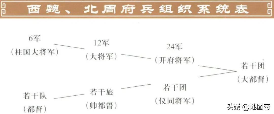 西魏的八柱國以下有十二大將軍、二十四開府、四十八儀同;軍隊四萬八千,將士爲軍戶,兵農合一,平時種地,戰時自備兵器和糧餉,這是府兵制的雛形。