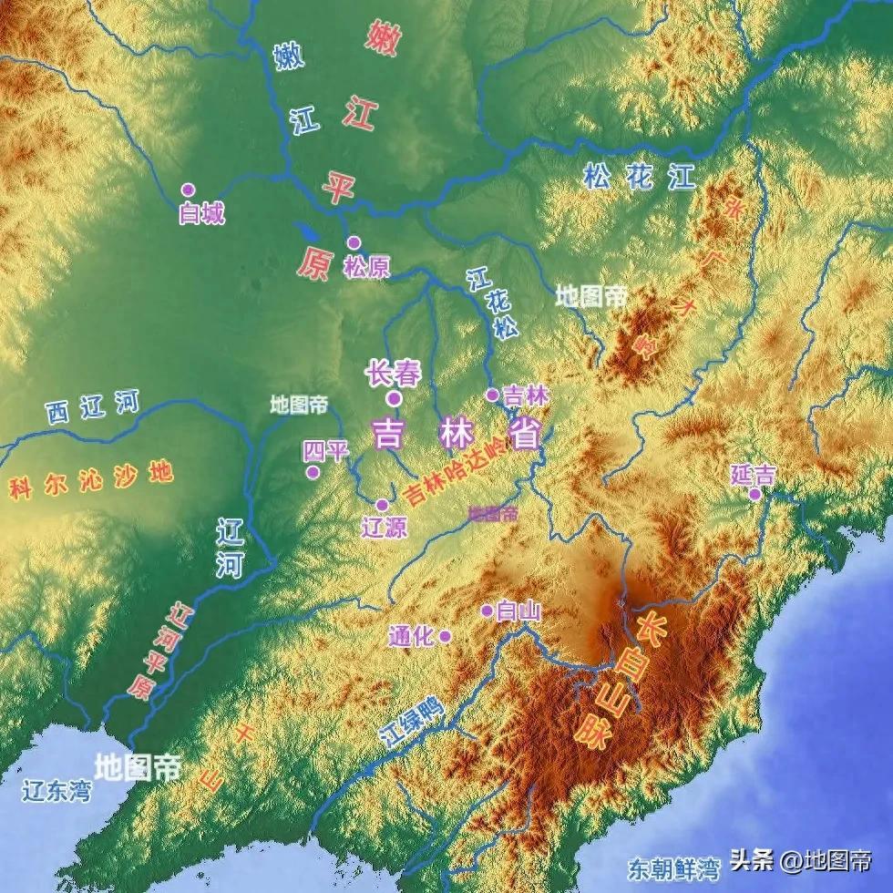 吉林省整體地勢東南高,西北低,東南部是長白山脈的支脈牡丹嶺、南崗嶺、老嶺、張廣才嶺、威虎嶺、老爺嶺、吉林哈達嶺、大黑山,西北部則是東北平原的松嫩平原。