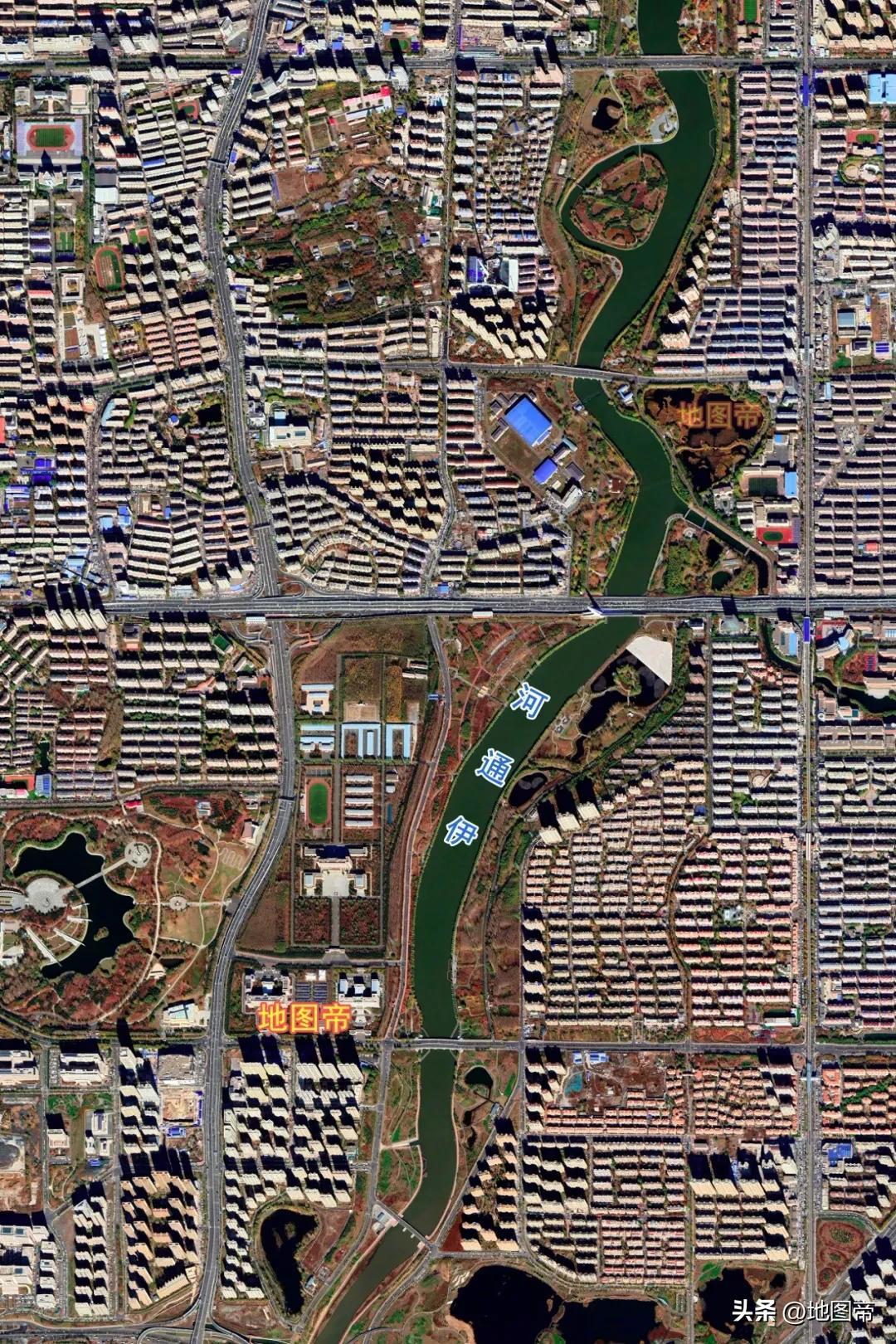 伊通河自南向北穿過長春市區,隨後匯入飲馬河,再匯入松花江,市區海拔200-210米,市中心緯度是北緯43°53′49″。