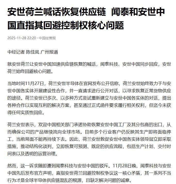 安世荷蘭的“公開甩鍋信”是在顛倒黑白,環球時報,2025-11-29
