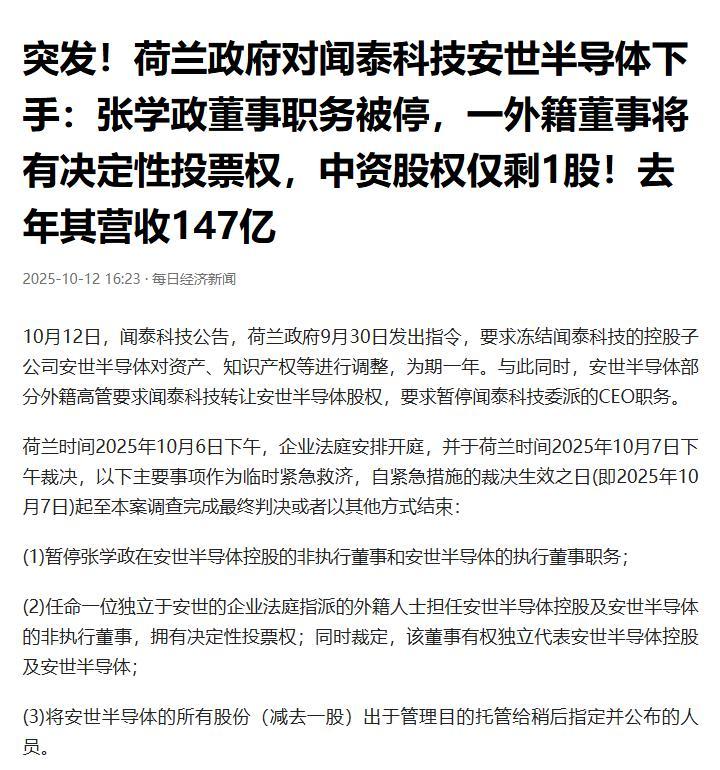 荷蘭政府暫停禁令,聞泰尚未完全重新掌控安世,第一財經,2025-11-19