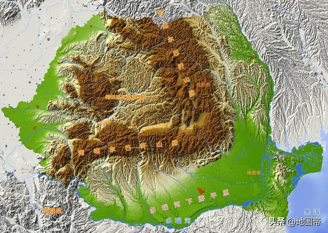 喀爾巴阡山脈,呈弧形,長超過1500千米,寬從12到500千米不等。喀爾巴阡山脈分爲西、東、南三段,其中南段和東端的南部在羅馬尼亞。