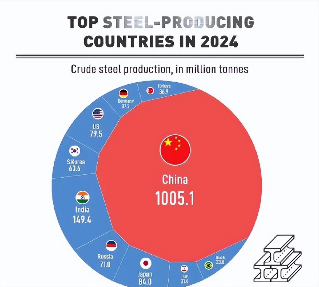 數據打臉。1949年,中國鋼產量15.8萬噸,不夠一人一把菜刀。2019年,鋼產量9.96億噸,佔全球半壁江山。