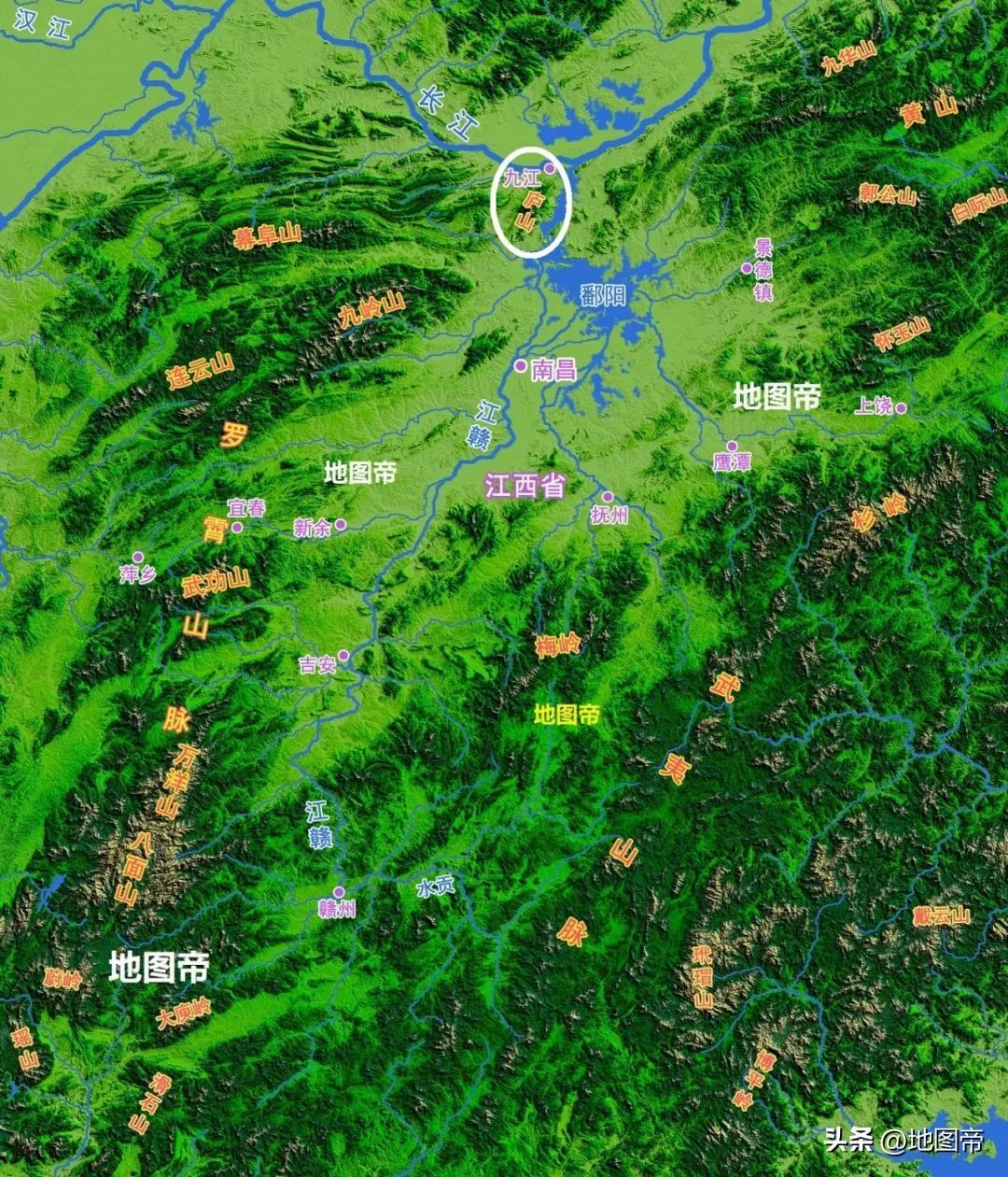 九江市的範圍,大致在長江、武夷山脈的九華山、鄱陽湖、羅霄山脈的幕阜山和九嶺山之間,輪廓像一頭牛,頭朝東仰天長嘯。