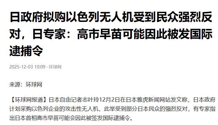 日政府擬購以色列無人機受到民衆強烈反對,日專家:高市早苗可能因此被髮國際逮捕令,環球網,2025-12-03