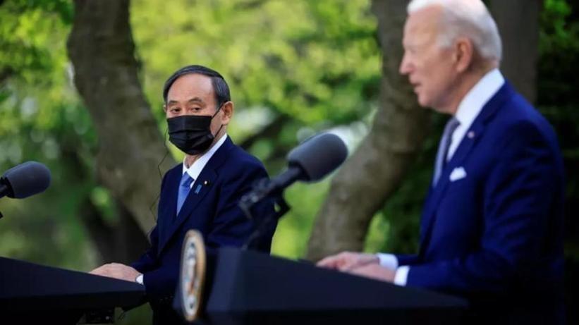 2021年4月,菅義偉去見拜登,兩個人關起門來簽了份聯合聲明。