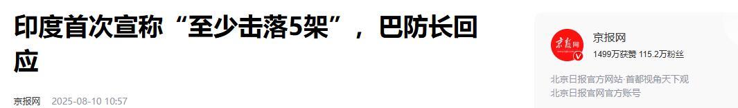 2.《印度首次宣稱“至少擊落5架”,巴防長回應》2025-08-10 10:57 | 來源:京報網