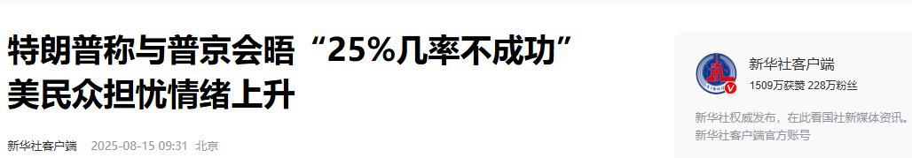 1.《特朗普稱與普京會晤“25%幾率不成功” 美民衆擔憂情緒上升》2025-08-15 09:31 | 來源:新華社客戶端