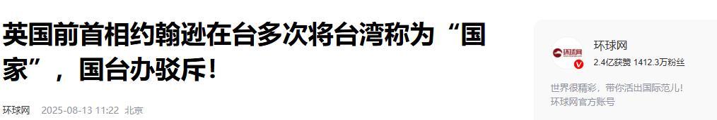 1.《英國前首相約翰遜在臺多次將臺灣稱爲“國家”,國臺辦駁斥!》2025-08-13 11:22| 來源:環球網