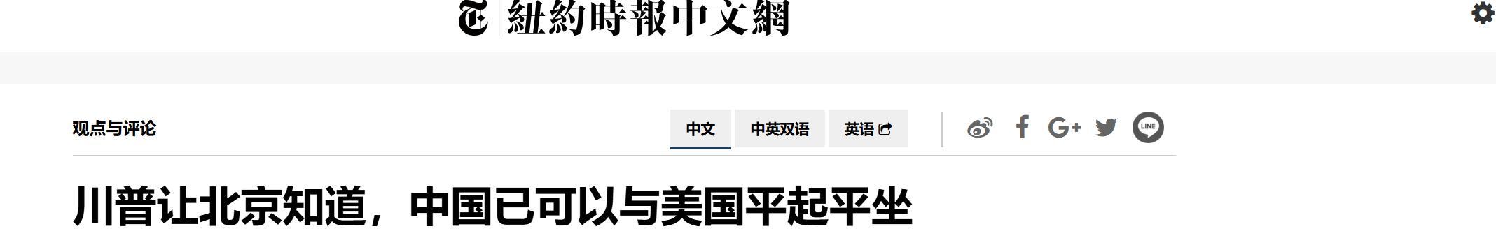 著名“反川”媒體《紐約時報》就寫了一篇文章,名爲《特朗普讓北京知道,中國已可以與美國平起平坐》。
