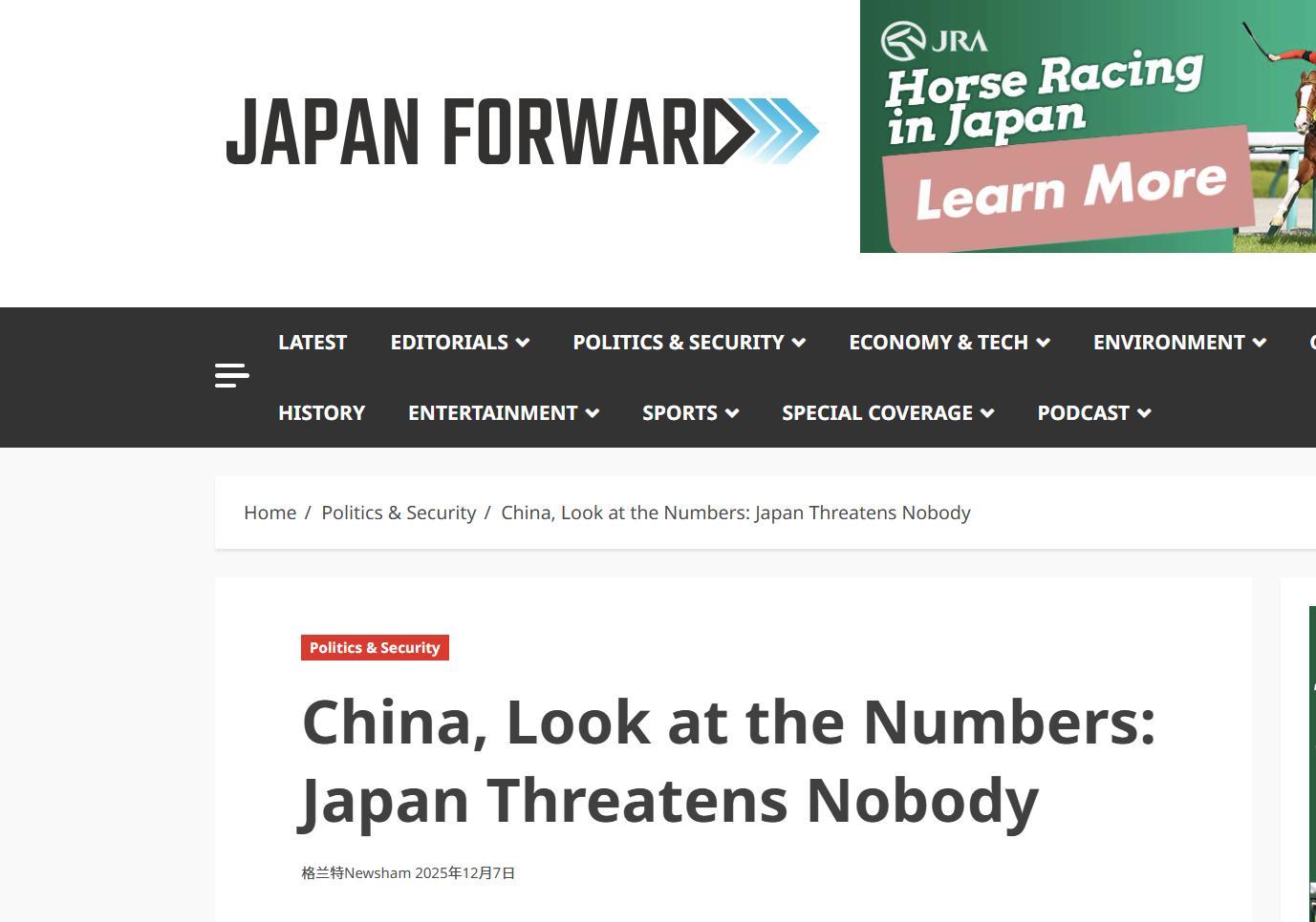 在這個背景下,一些原本對華極度強硬的日媒突然開始服軟了,其中以“Japan Forward”最爲典型。在東海事件之前,“Japan Forward”一直試圖將解放軍描述爲“紙老虎”,但如今卻刊登出一篇奇文,名叫《中國,看看數據吧:日本威脅不了任何人》。