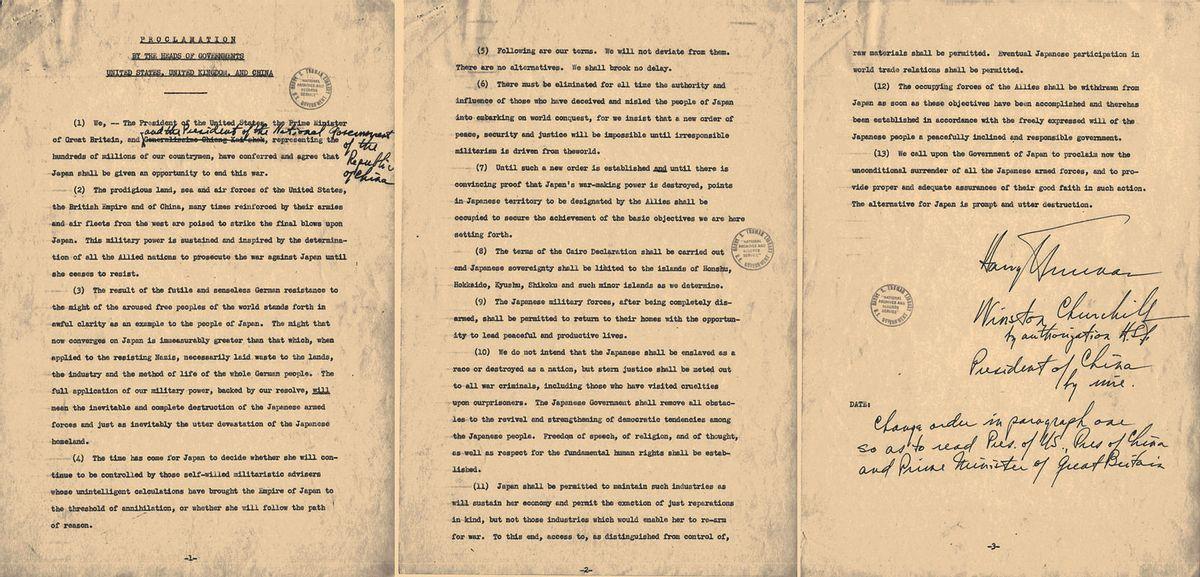 1943年《開羅宣言》規定:日本所竊取於中國之領土,例如東北四省、臺灣、澎湖羣島等,歸還中華民國。1945年《波茨坦公告》規定:日本之主權必將限於本州、北海道、九州、四國及吾人所決定其他小島之內。