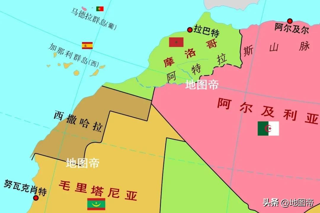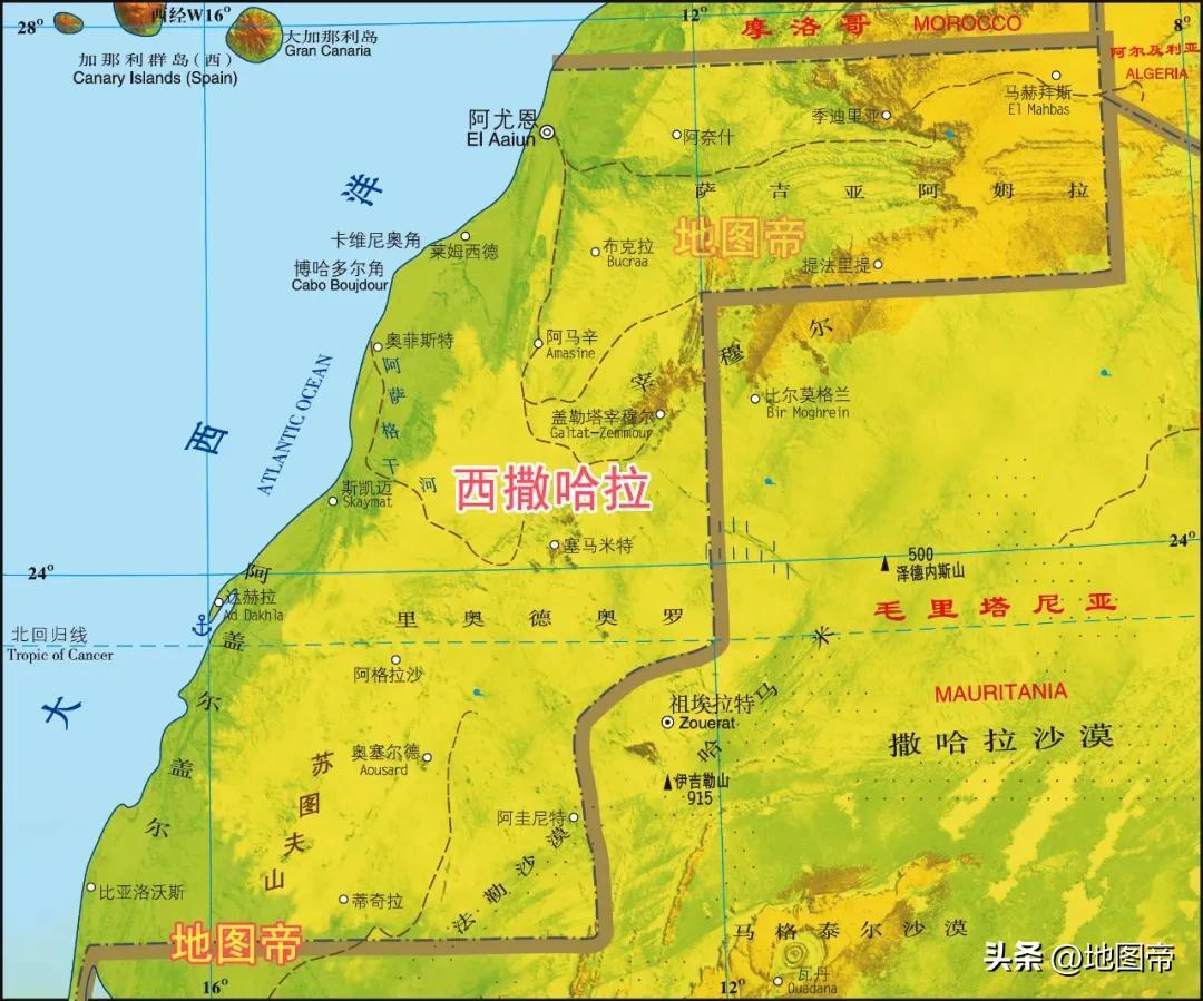 西撒哈拉以前是西班牙的殖民地,西班牙撤出之後,摩洛哥和毛里塔尼亞瓜分了西撒哈拉。但當毛里塔尼亞也撤出西撒哈拉時,摩洛哥立刻拿下毛里塔尼亞之前佔領的約9萬平方千米。摩洛哥實控西撒哈拉絕大部分地區,但目前還有四十多個國家與西撒哈拉建交,這件事懸而未決。