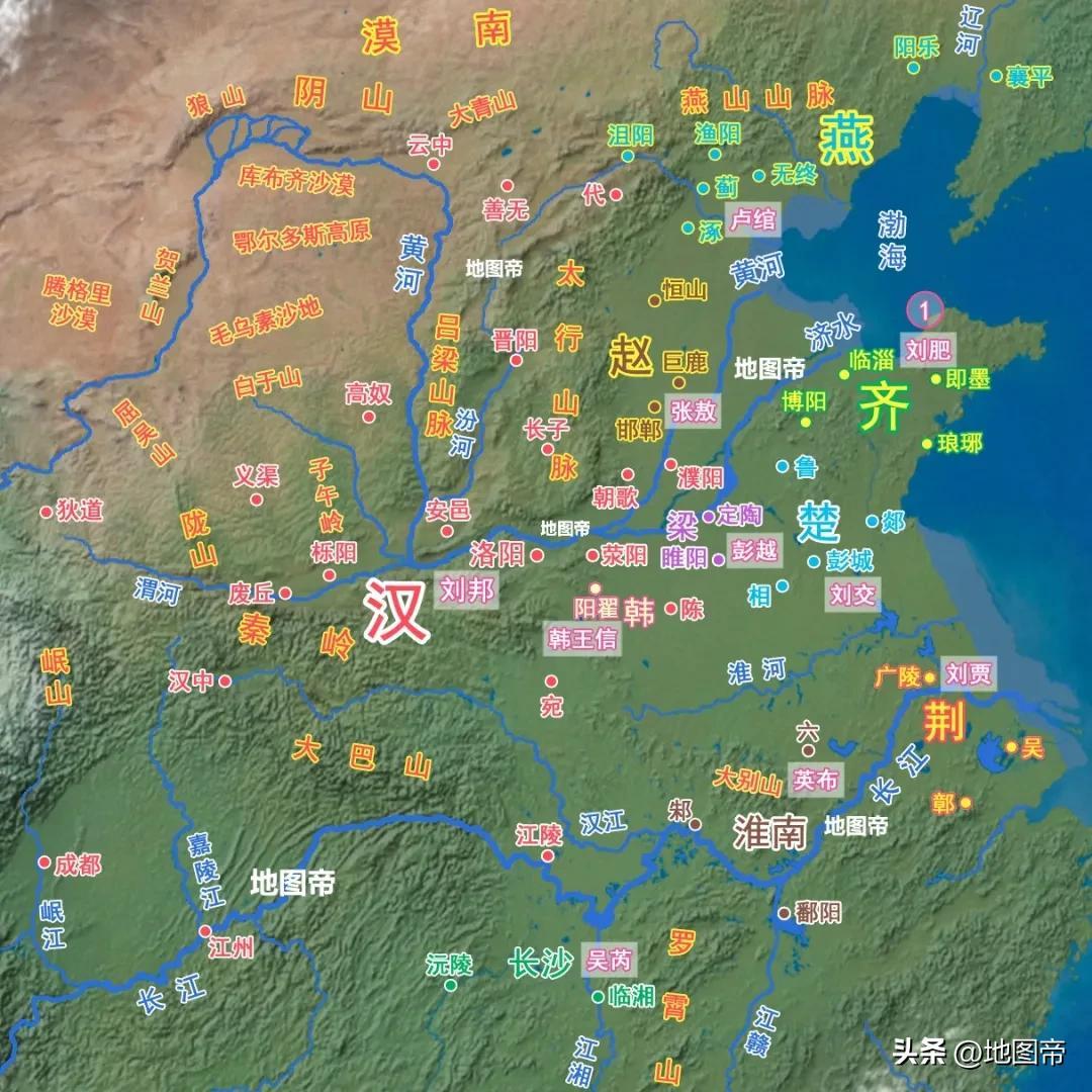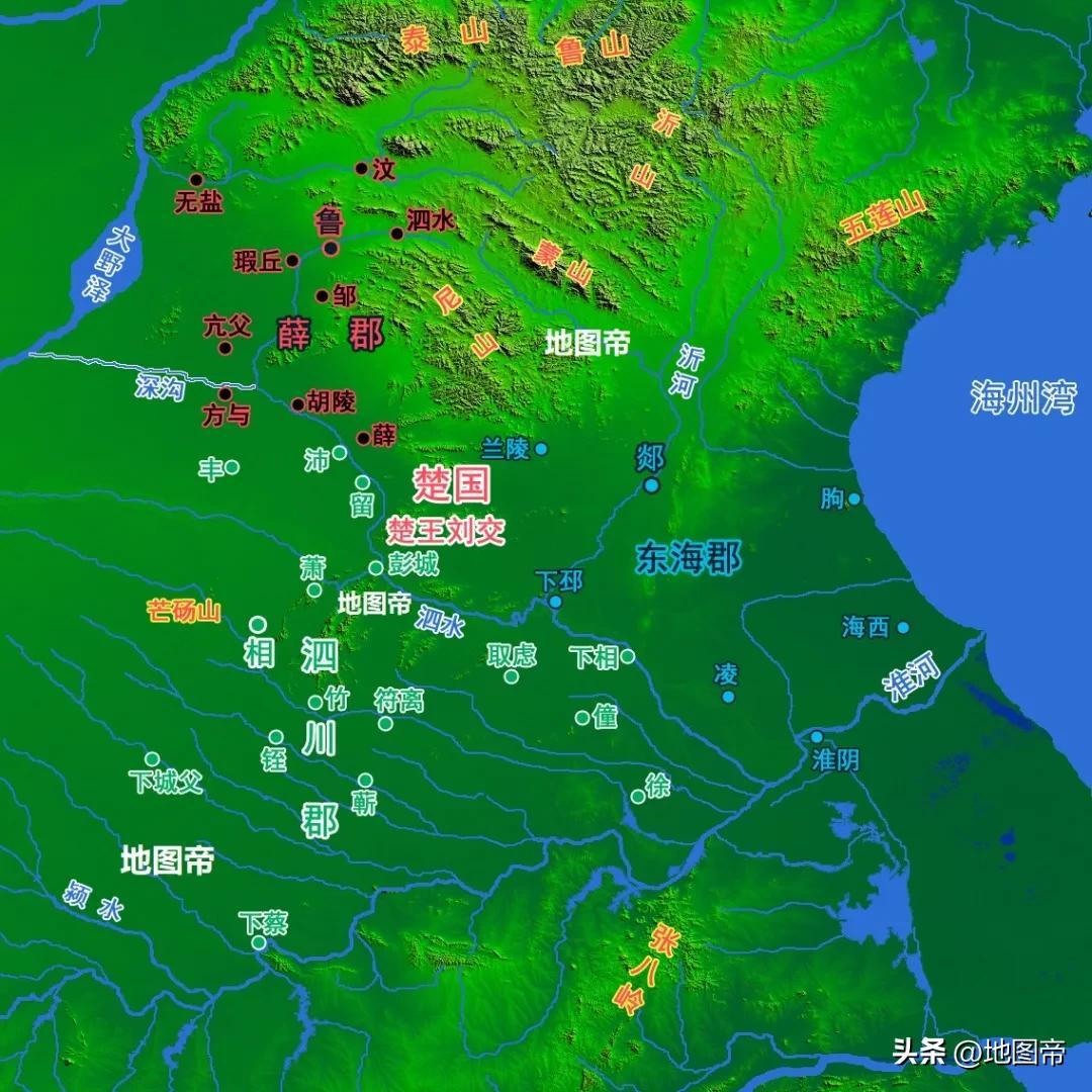 劉邦稱帝后,以親弟劉交爲楚王,定都彭城,有三個郡,後分爲五個郡(國),計三十六個縣。