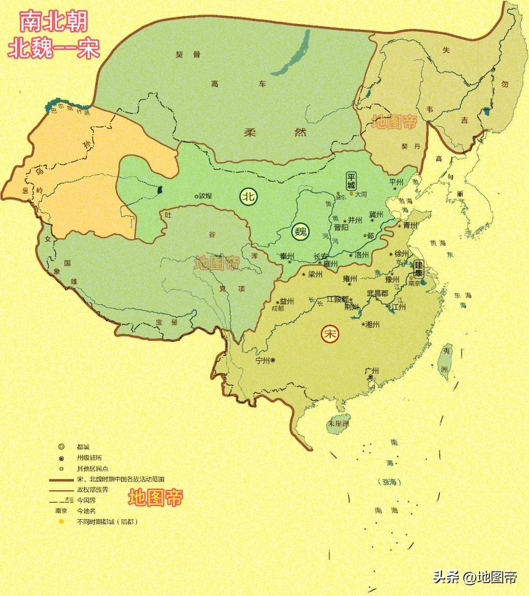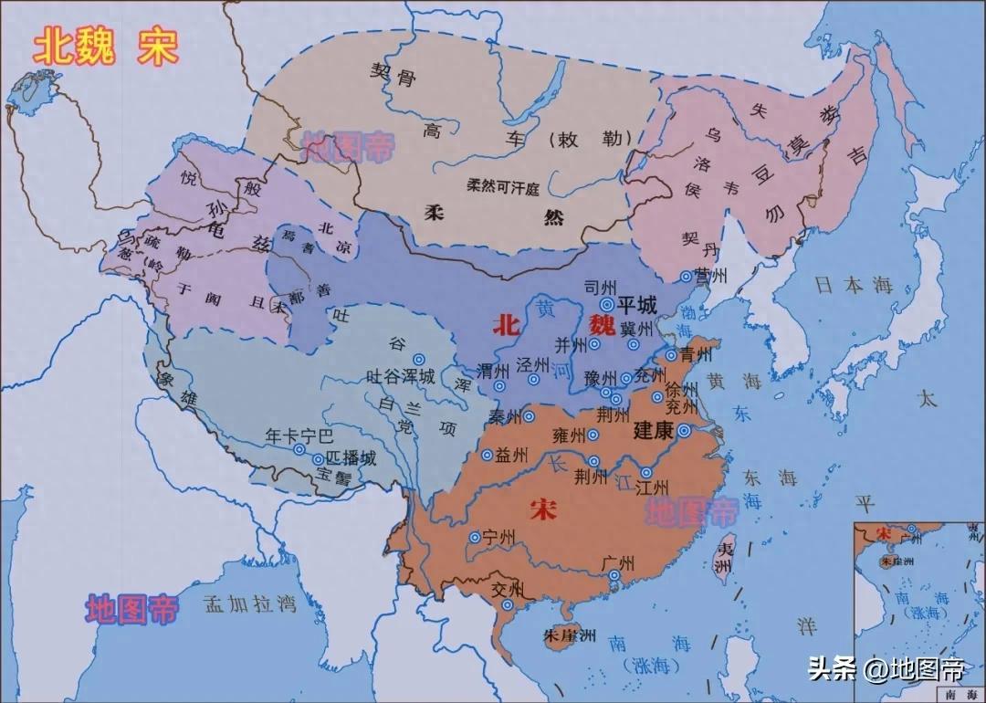 劉宋是南朝宋齊梁陳中面積最大的,所謂“七分天下而有其四”,比北宋不足,比南宋有餘。南朝宋不僅牢牢控制秦嶺-淮河一線,包括南陽、汝南、陳留、彭城(徐州),東北部還佔據大半個山東半島,西南部控制雲貴高原、紅河三角洲等地。