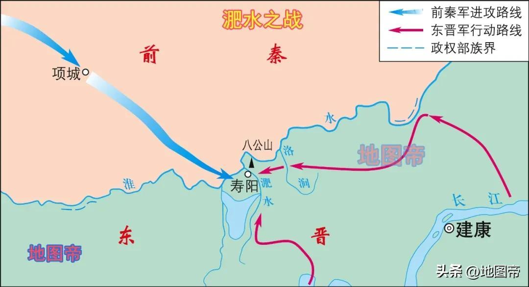 383年(前秦世祖建元十九年、東晉孝武帝太元八年),前秦出兵伐東晉,戰於淝水(今安徽淮南壽縣)。前秦軍號稱八十餘萬大軍,投鞭斷流;東晉七萬餘北府兵,八公山上,草木皆兵。東晉幸運地以少勝多,前秦苻堅軍大敗,敗退途中還風聲鶴唳,至洛陽時僅剩十餘萬人馬。