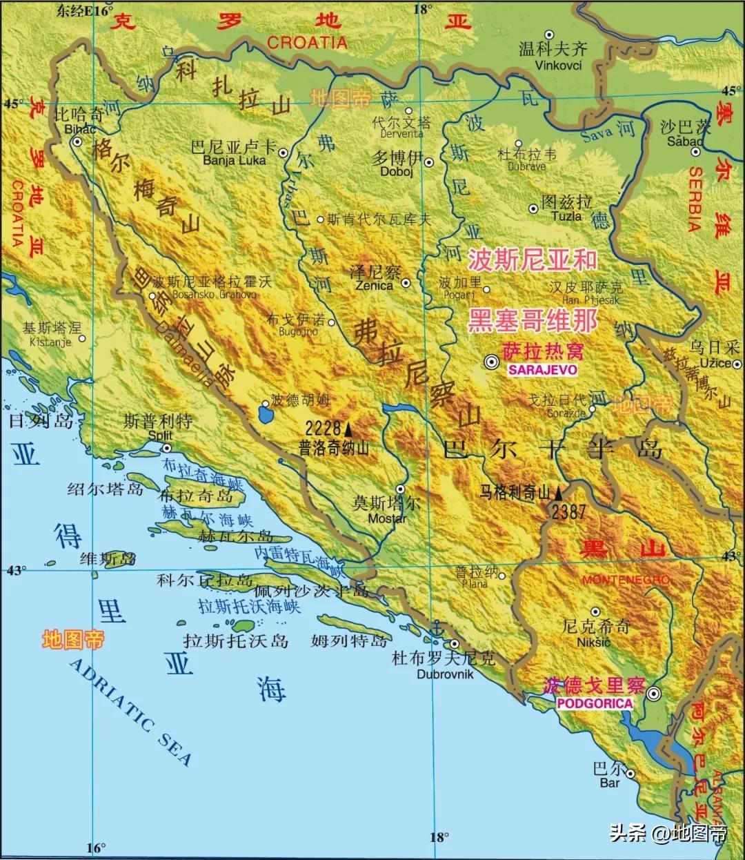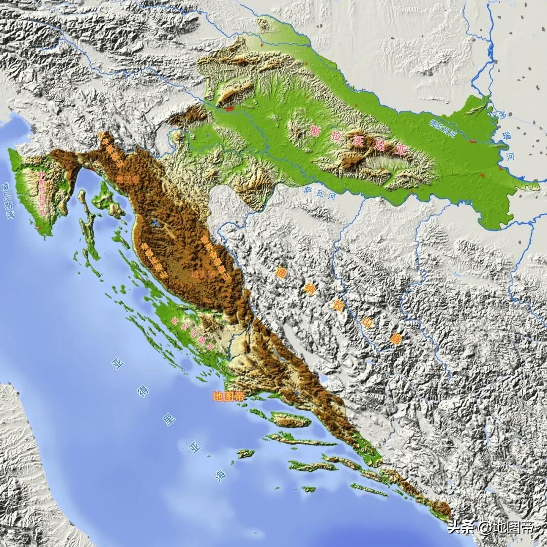 波黑多山,中部和西部是迪納拉山脈,森林覆蓋率42.7%,北部爲薩瓦河南岸的平原地區,南部小部分地區爲沿海平原。