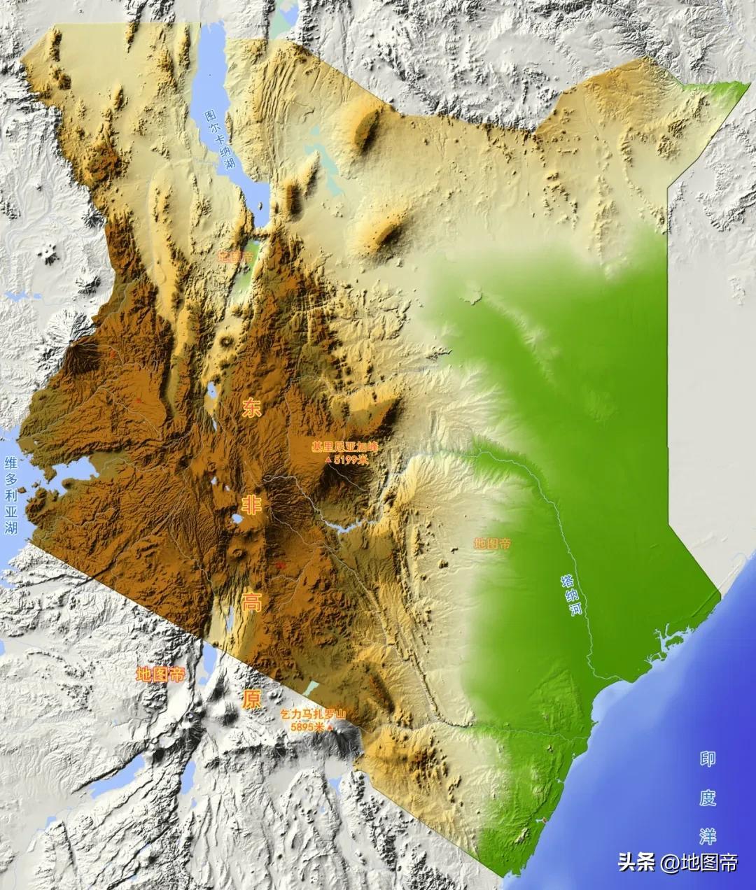 肯尼亞多高原,中西部是東非高原,最高峯基里尼亞加峯,海拔5199米,是非洲第二高峯。基里尼亞加峯緯度是南緯0°9′03″,幾乎就在在赤道上,日照強度大,在冰與火交鋒中,冰還是佔據優勢,山峯上常年積雪。肯尼亞東部沿岸是面積廣闊的平原,土地肥沃。