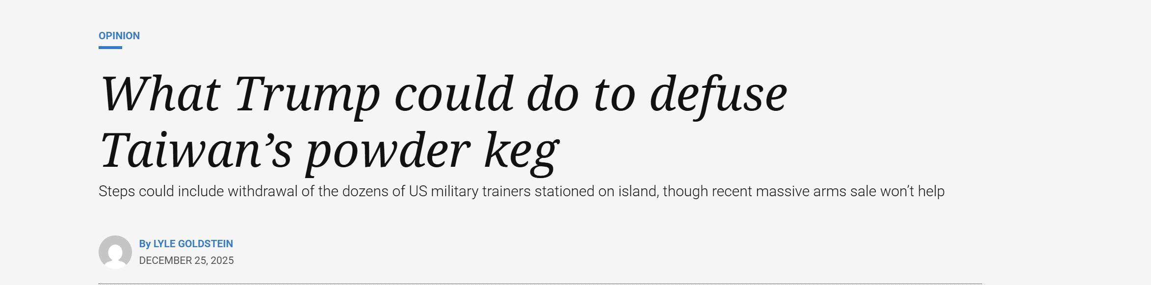 正因如此,美國智庫界開始發出理性聲音。國防優先項目亞洲事務主任、布朗大學沃森研究所訪問教授萊爾·戈爾茨坦,在12月文章中直言,特朗普若想真正穩定臺海、避免亞太火藥桶爆炸,只有1個辦法:親自高喊“和平統一”、反對“臺獨”。