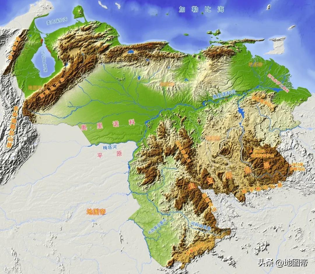 委內瑞拉地貌分爲四大板塊,西部是安第斯山脈梅里達山與佩裏哈山圍成的馬拉開波湖平原,中部是奧裏諾科河中下游的奧裏諾科平原,東部是圭亞那高原,北部是沿海山脈,最高峯爲安第斯山脈梅里達山的玻利瓦爾峯,海拔5007米。
