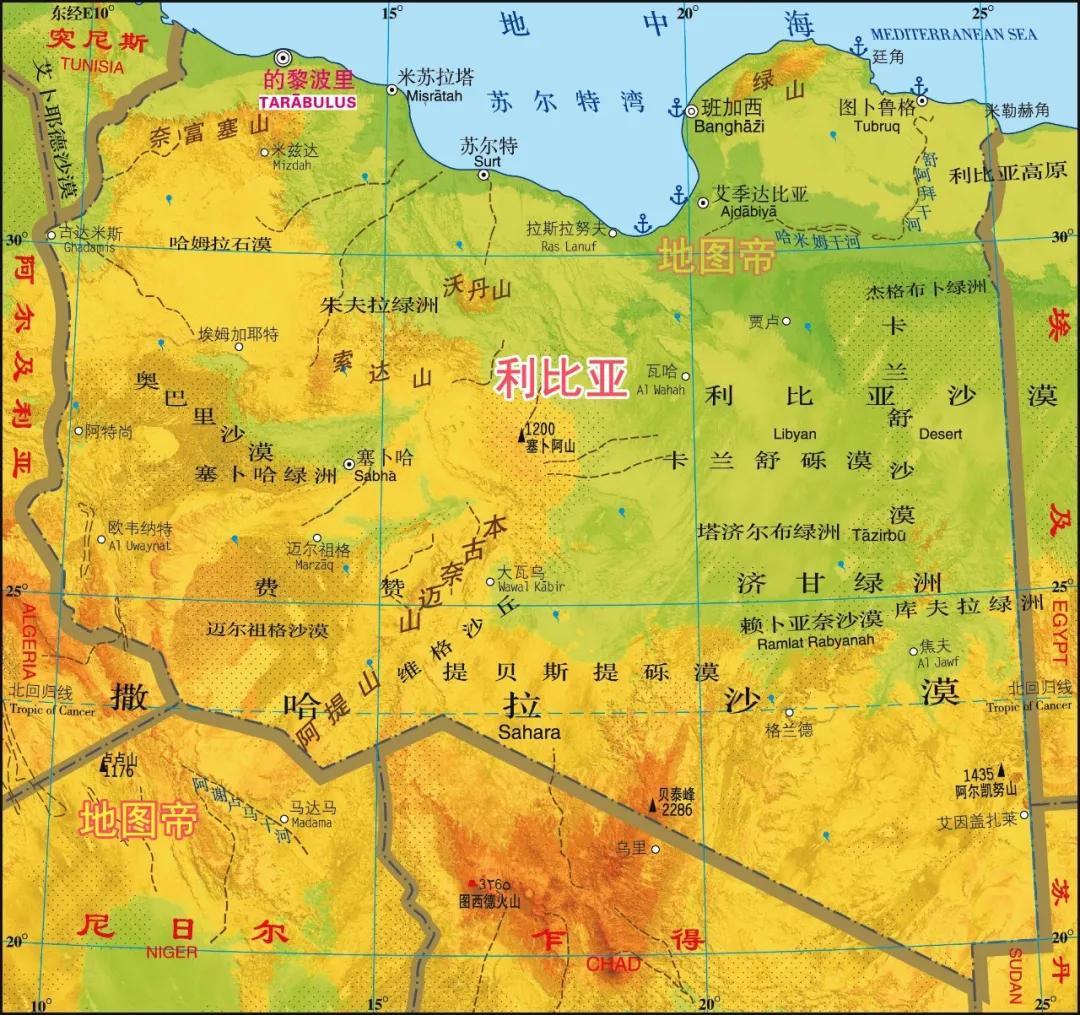 利比亞位於非洲北部,地處地中海南岸,海岸線長1900餘千米,面積約176萬平方千米,居世界第十六位。