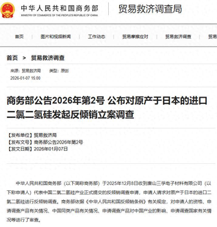 就在中國商務部發布1號公告後,又於1月7日發佈第二個重磅消息。商務部決定對原產於日本進口二氯二氫硅進行反傾銷調查。該物質是一種薄膜沉積材料,是製造芯片的重要材料,而這也讓日本知道了整個事件的嚴重性。