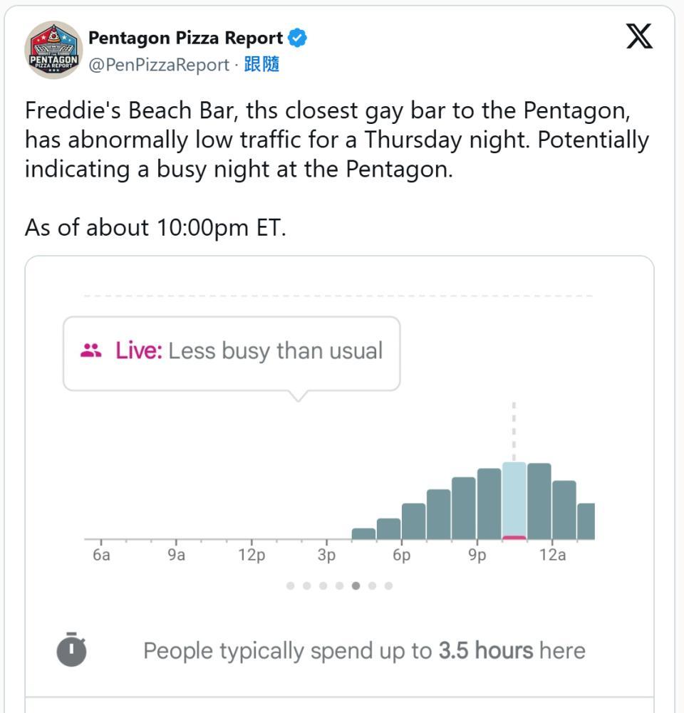 五角大樓披薩指數(Pentagon Pizza Index,或稱Pizza Meter) 是一個著名的民間OSINT(開源情報)指標,通過追蹤五角大樓周邊披薩店的客流量/訂單激增,來推測美國國防部是否進入“加班危機模式”(即高層連夜開會、規劃重大行動)。