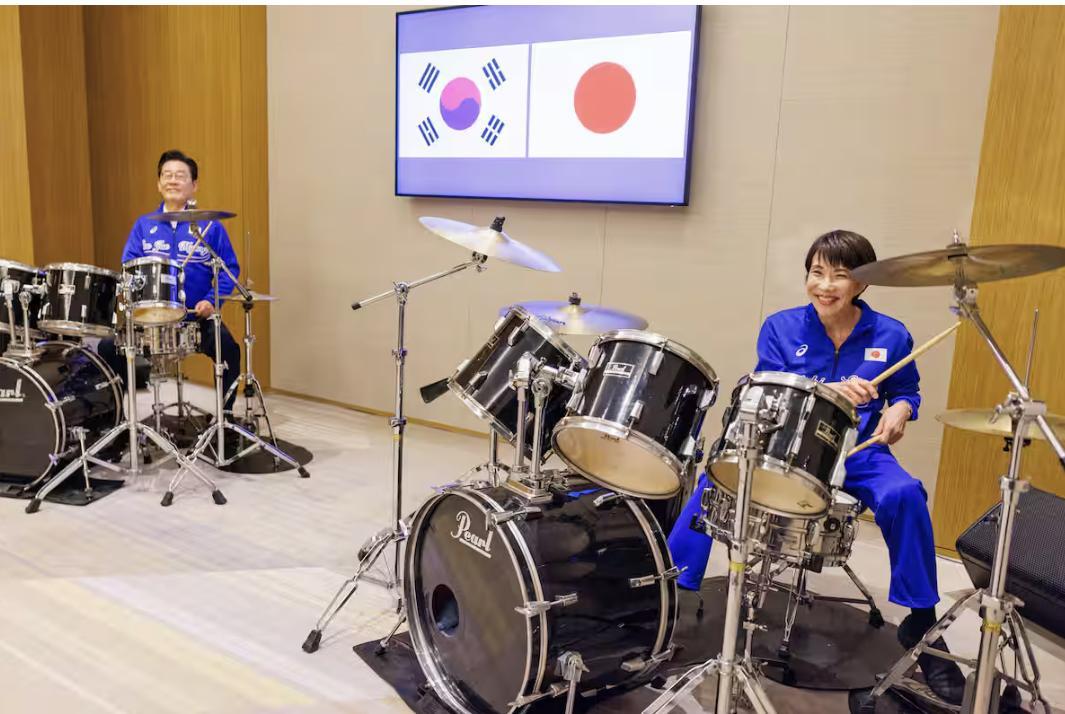 更令人意外的是,高市早苗給了李在明一個“浪漫一刻”。 會談間隙,兩人相約一起打架子鼓,演奏BTS的《Dynamite》和Netflix劇集《愛的迫降》主題曲。
