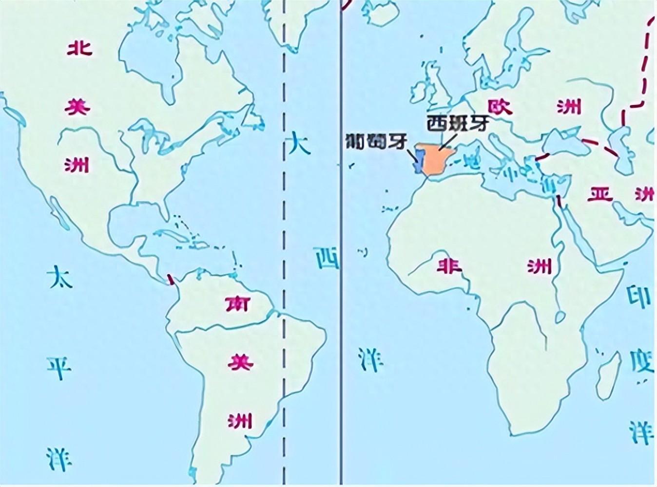 在大西洋的一個小島上,西班牙和葡萄牙兩個帶頭大哥,鋪開一張世界地圖,手裏拿着尺子和筆,像切西瓜一樣,在地圖上畫了一條線。