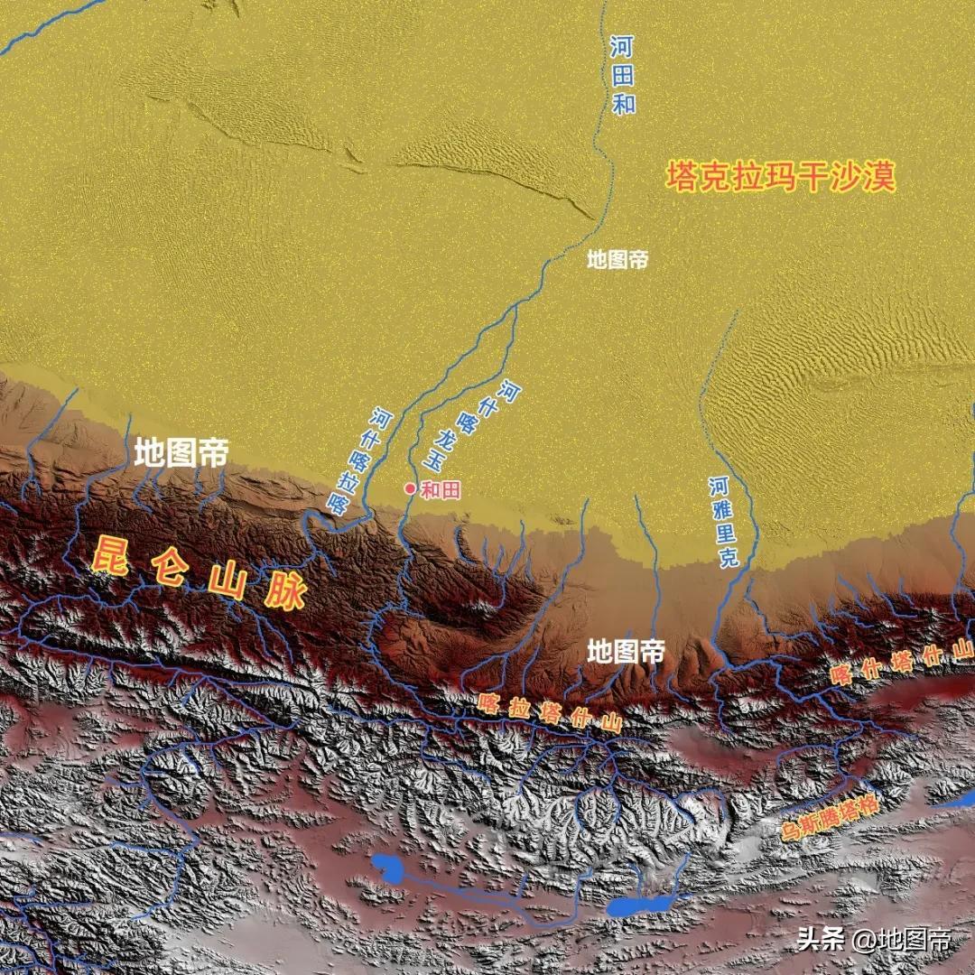 和田地區位於新疆最南端,南枕崑崙山脈,北部深入塔克拉瑪干沙漠腹地,面積24.74萬平方千米。和田地勢南高北低,南部雄偉的崑崙山成弧形橫貫東西,中部爲峽谷遍佈的山前坡麓地帶,北部爲塔克拉瑪干沙漠,由南部山地7167米下降到北部1050米。