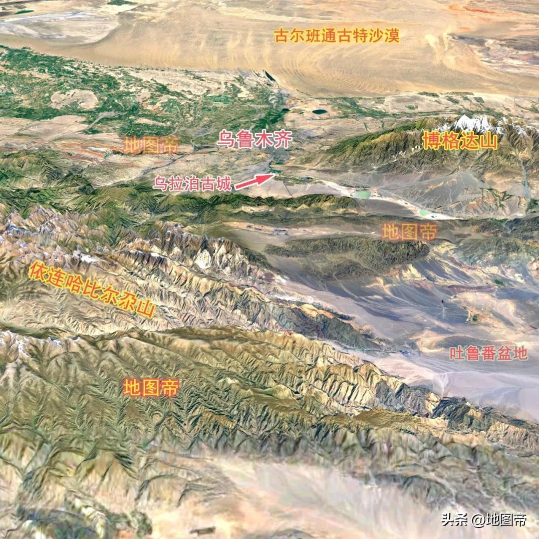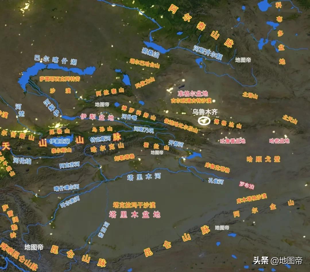 準噶爾盆地中間幾乎都是沙漠,城市大多分佈在邊緣,其中南緣有烏魯木齊、石河子,西緣有克拉瑪依等。