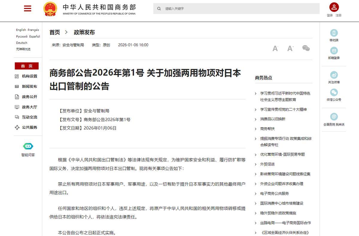 2026年1月6日,中國商務部發表年度1號公告,禁止所有有可能提升日本軍事實力的軍民兩用物項對日出口,並且明確會對第三方追責。