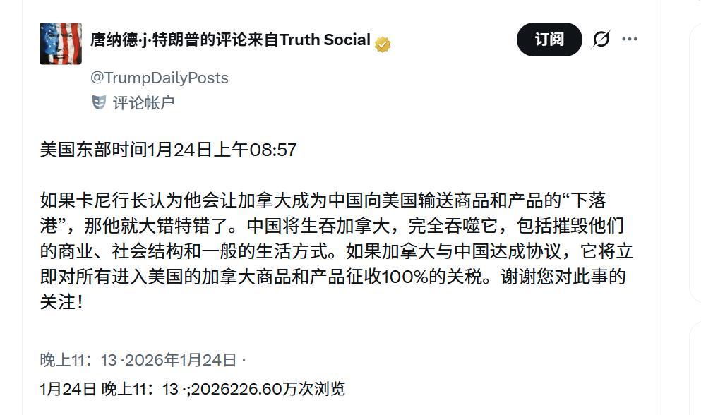 “如果卡尼行長認爲他會讓加拿大成爲中國向美國輸送商品和產品的‘下落港’,那他就大錯特錯了。中國將生吞加拿大,完全吞噬它,包括摧毀他們的商業、社會結構和一般的生活方式。如果加拿大與中國達成協議,它將立即對所有進入美國的加拿大商品和產品徵收100%的關稅。謝謝您對此事的關注!”
