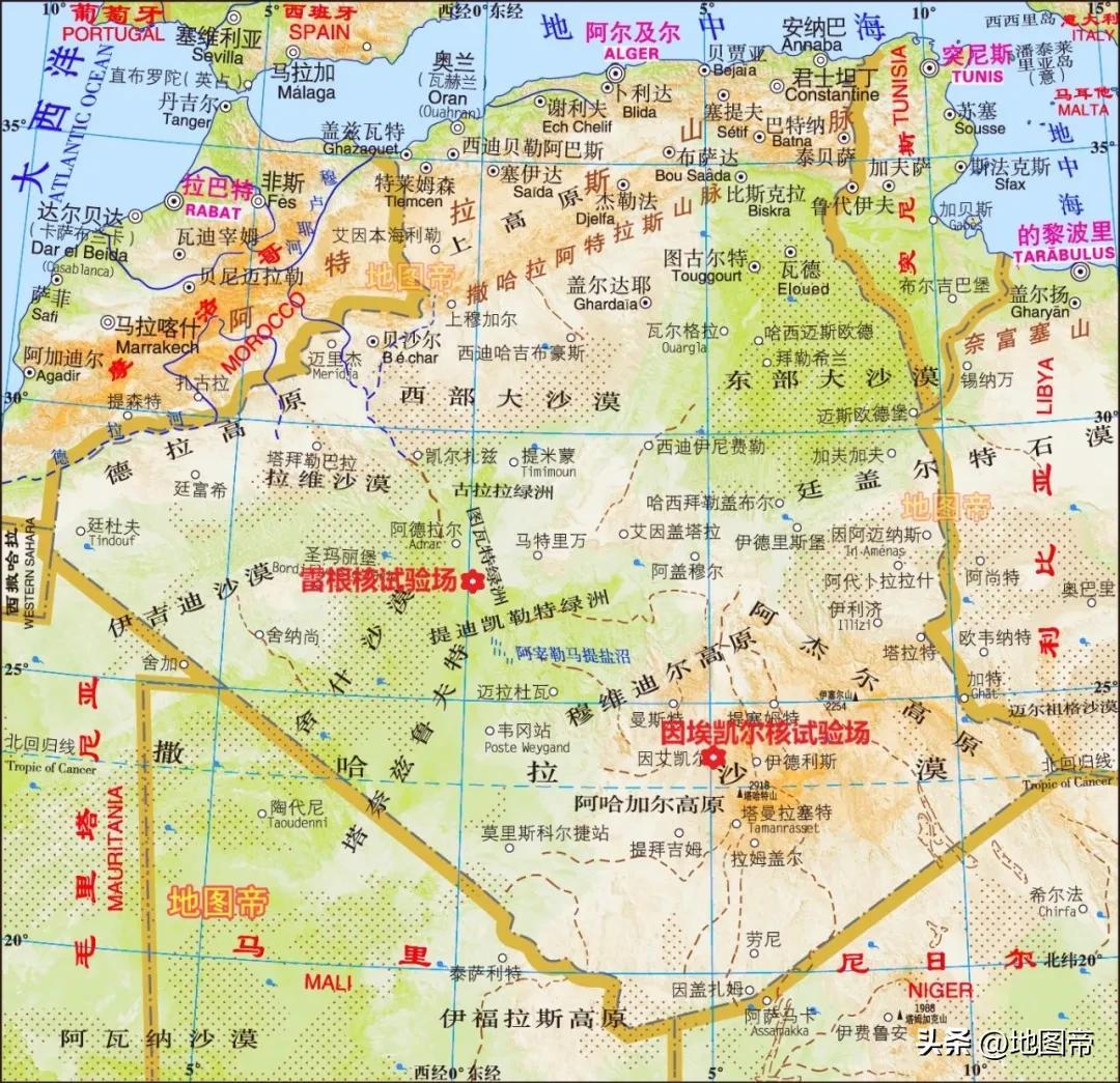 阿爾及利亞爲阿特拉斯山脈中段,包括泰勒阿特拉斯山和撒哈拉阿特拉斯山。