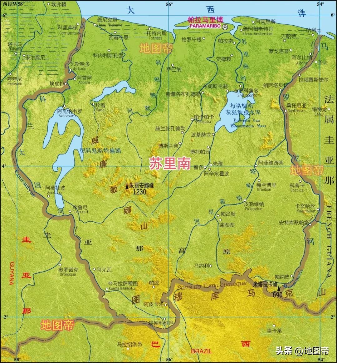 現在圭亞那高原自西往東是:委內瑞拉、圭亞那、蘇里南、法屬圭亞那、巴西阿馬帕州。