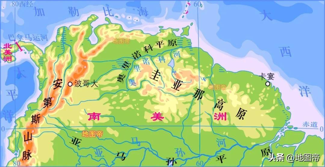 圭亞那高原位於南美洲北部,是亞馬孫河與奧裏諾科河的分水嶺,大體上西高東低,西部幾座山脈較高,包括邁瓜利達山、帕裏馬山、庫魯皮拉山、帕卡賴馬山脈等,東部山脈海拔較低,包括圖穆庫馬克山、倫巴達山等。